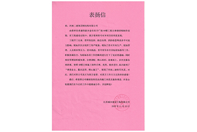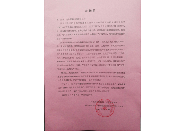 282021.01中鐵四局集團(tuán)第一工程有限公司向河南二建集團(tuán)鋼結(jié)構(gòu)有限公司發(fā)來(lái)表?yè)P(yáng)信 -