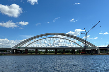 哈薩克斯坦阿斯塔納市輕軌一期伊希姆河鋼拱橋項(xiàng)目該拱橋位于哈薩克斯坦總統(tǒng)府旁,橋長(zhǎng)155m,為下承式簡(jiǎn)支系桿拱,主拱矢高2m,拱肋和主梁均采用鋼結(jié)構(gòu),拱肋采用鋼箱拱,主梁為鋼結(jié)構(gòu)縱橫梁體系。 -